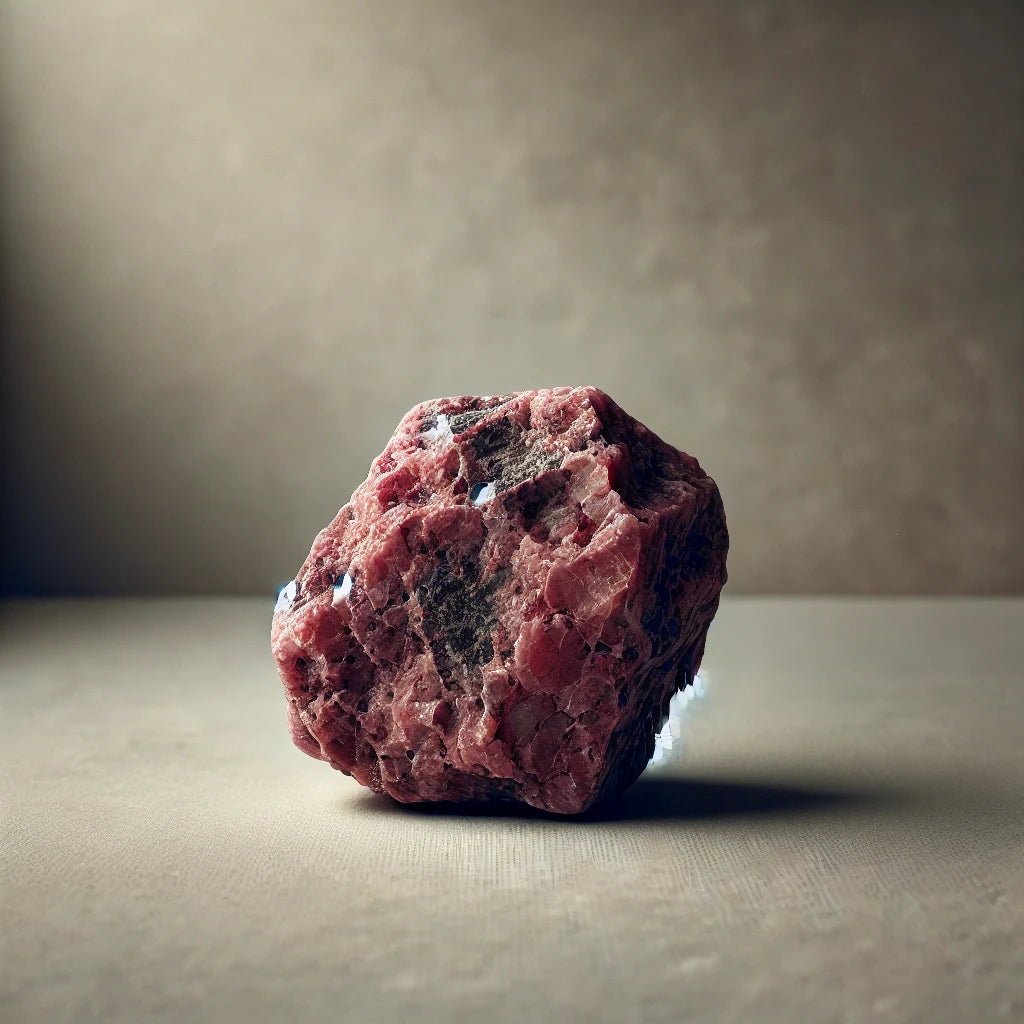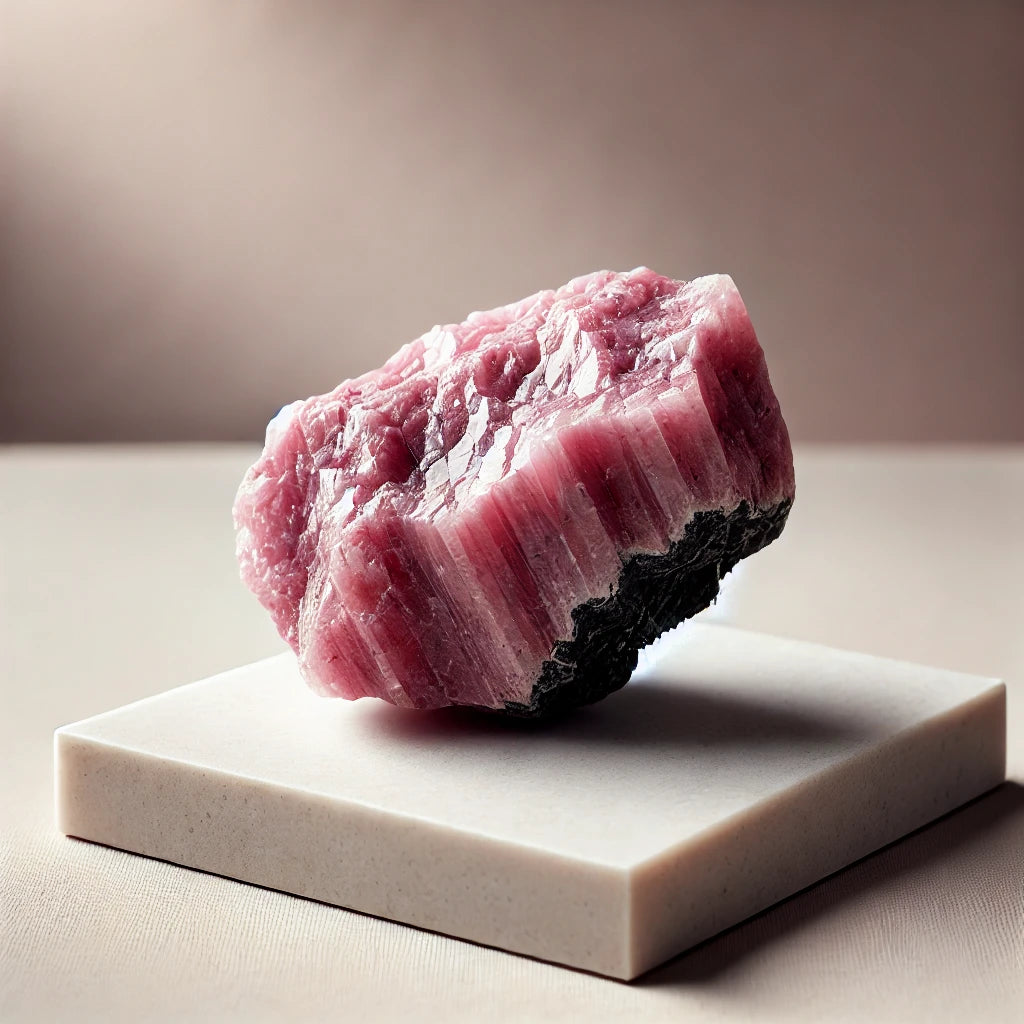 Der Rhodonit wird für seine außergewöhnliche Farbgebung und symbolische Tiefe geschätzt. Mit seinen zarten Rosatönen, durchzogen von dunklen Adern, verkörpert er eine kraftvolle Verbindung von Eleganz und Natürlichkeit.